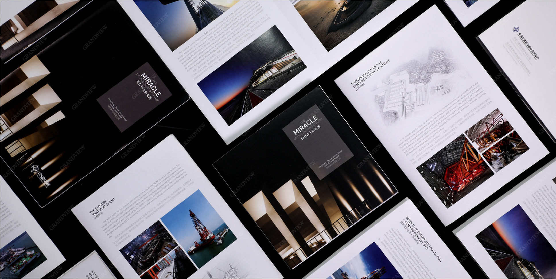 畫冊圖片以藍色為主色調,與主題《伶仃洋上的奇跡》遙相呼應;多采用大跨頁精美圖片,形成強烈的視覺沖擊;板塊清晰、結構完整、既能全方位概括,又有重點突出,將島隧工程完美展現。